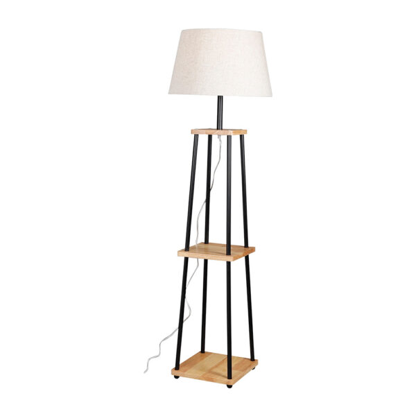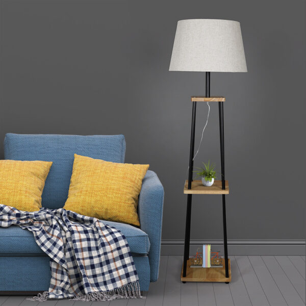 أباجورة أرضية بأرفف خشبية موديل ثري قاعدة حديدية وغطاء من قماش الكتان: