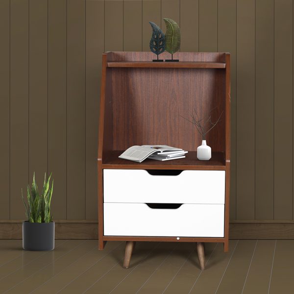 خزانة جانبية موديل سبورت بدرجين وسطح ورف خشبي لون بني وأبيض، مصنوعة من خشب ال MDF 18 MM، مغطى بطبقة من الميلامين المقاوم للخدوش والأمن على الصحة، الوزن 27 كجم، الطول 53.5 سم، العرض 40 سم، الارتفاع 90.5 سم.