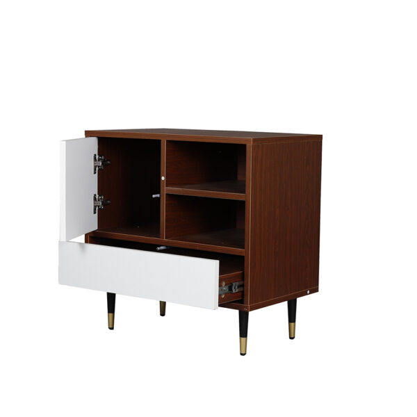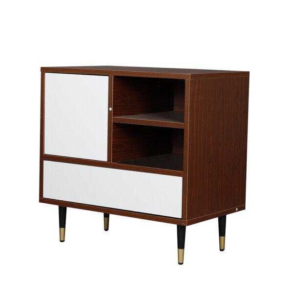 خزانة جانبية موديل ناين بدرج ووحدات تخزين لون بني وأبيض بأرجل حديدية لون أسود وذهبي تصميم عصري وجميل يحتاجه منزلك: